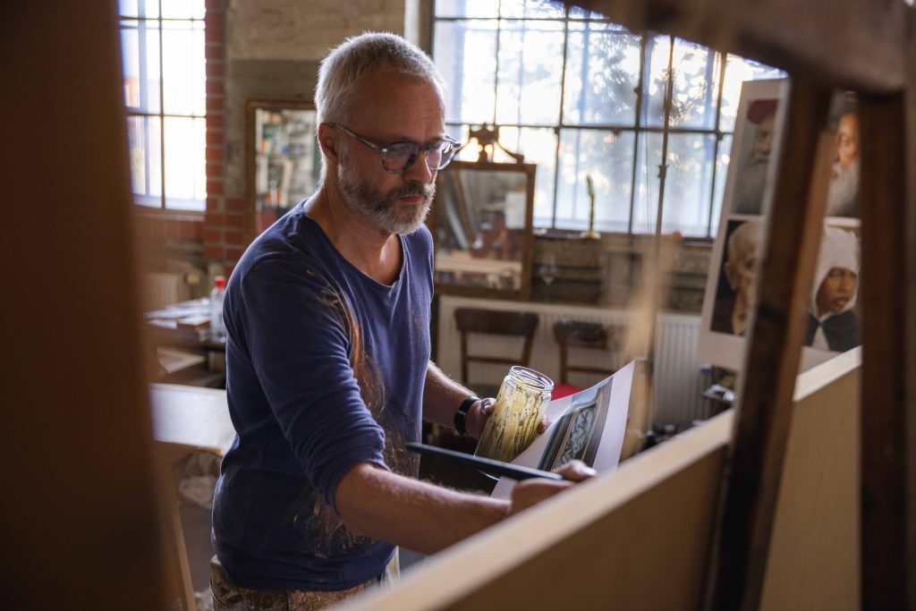 Dann begleiten wir Triegel auf eine Reise in die Vergangenheit: nach Florenz. Er erzählt von seinen DDR-Träumen, die Welt zu bereisen; vom Mauerfall; als er 1000 Westmark geschenkt bekam und damit nach Florenz und Rom gereist war. Er erzählt von seinem Studium, als es darum ging, ob man denn noch figürlich malen dürfe. „Da müssen Sie bockig sein“, ermunterte ihn einer seiner Lehrer. Und dann begleiten wir ihn wieder bei seiner Arbeit an der Leinwand, bei der Auswahl der Modelle – Bonhoeffer zum Beispiel, oder Triegels Frau Christine.